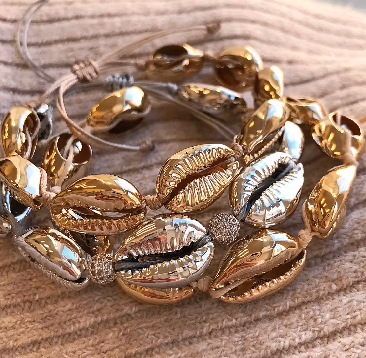 Använd dubbel tråd och trä trådarna från olika håll genom snäckan, fortsätt med knut så blir armbandet stadigt.