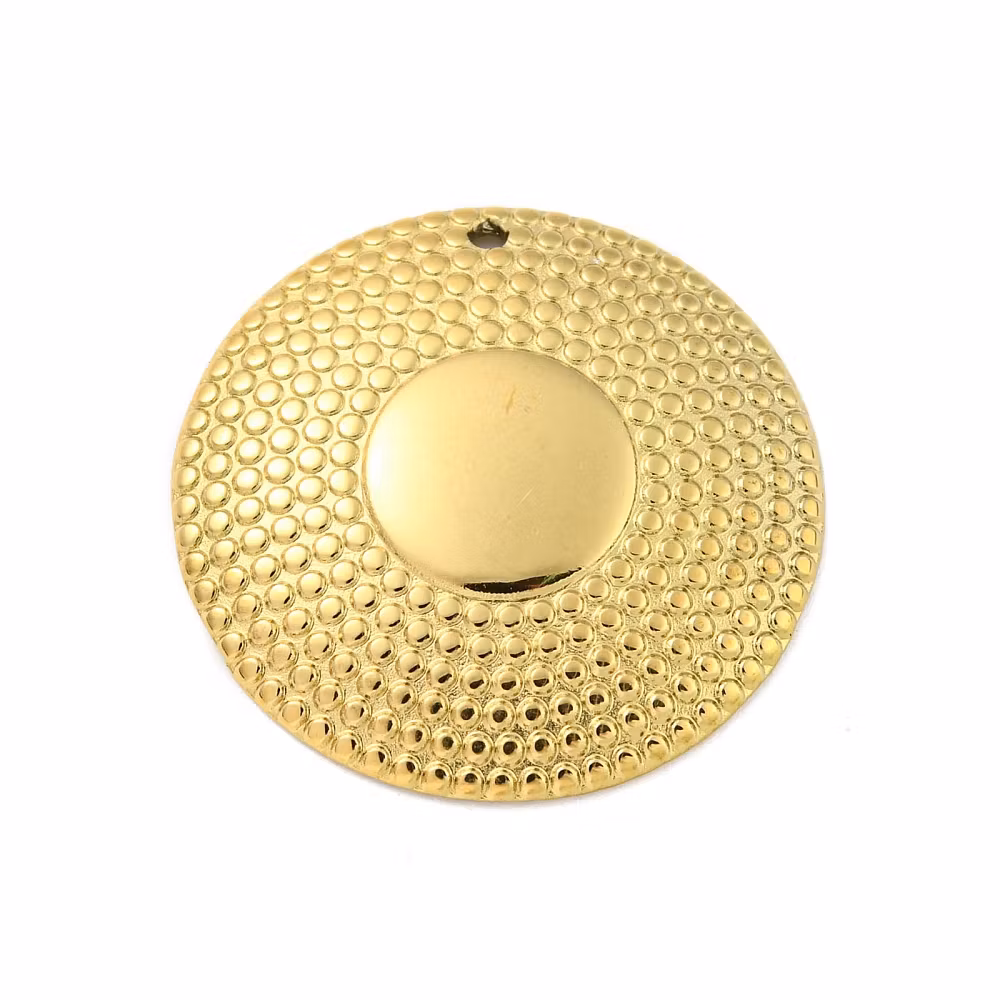 Guldfärgat rostfritt stål litet hänge rund & mönstrad med PVD plätering, 1 st
