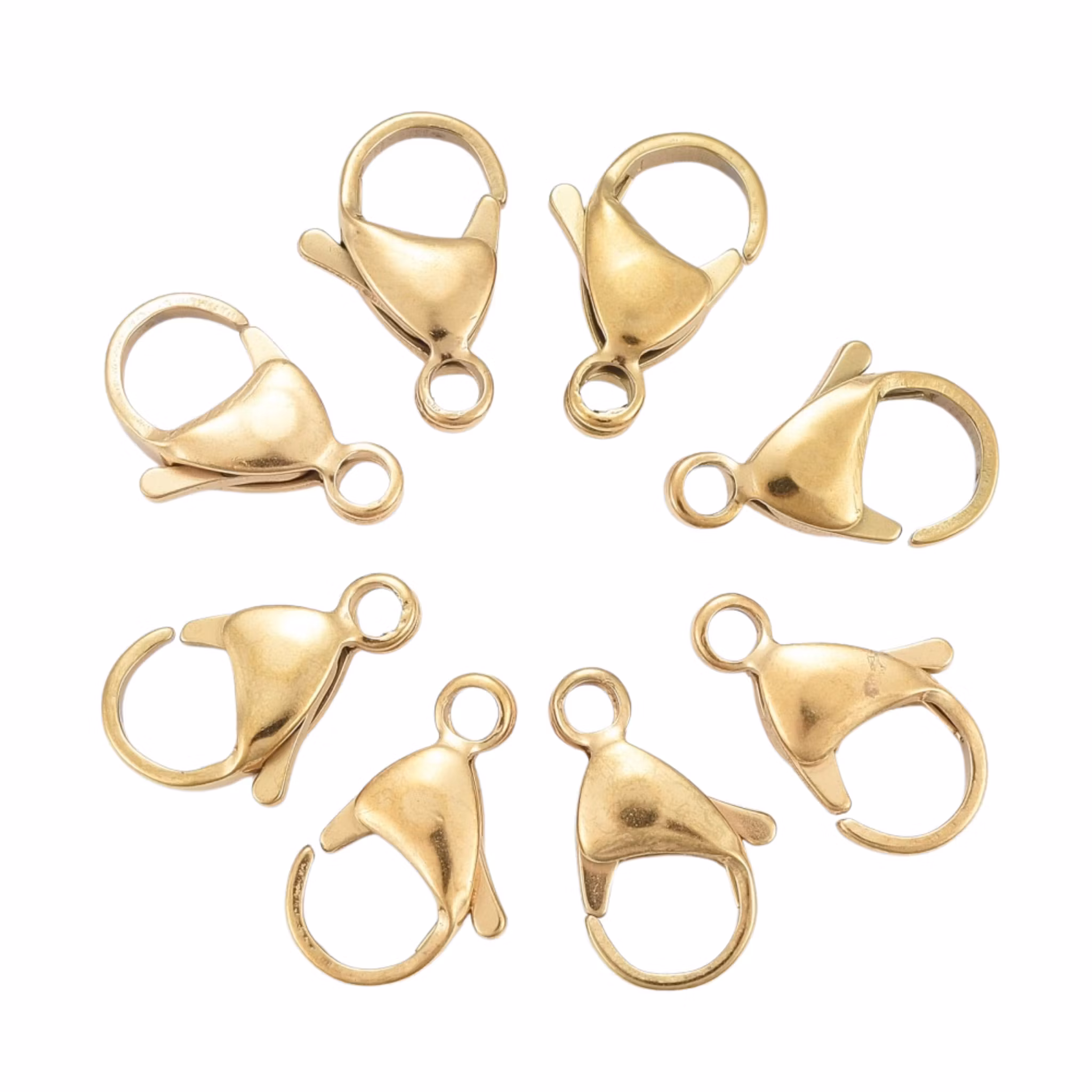 Guldfärgat kirurgiskt stål klolås 10 mm med PVD plätering, ca 50 st