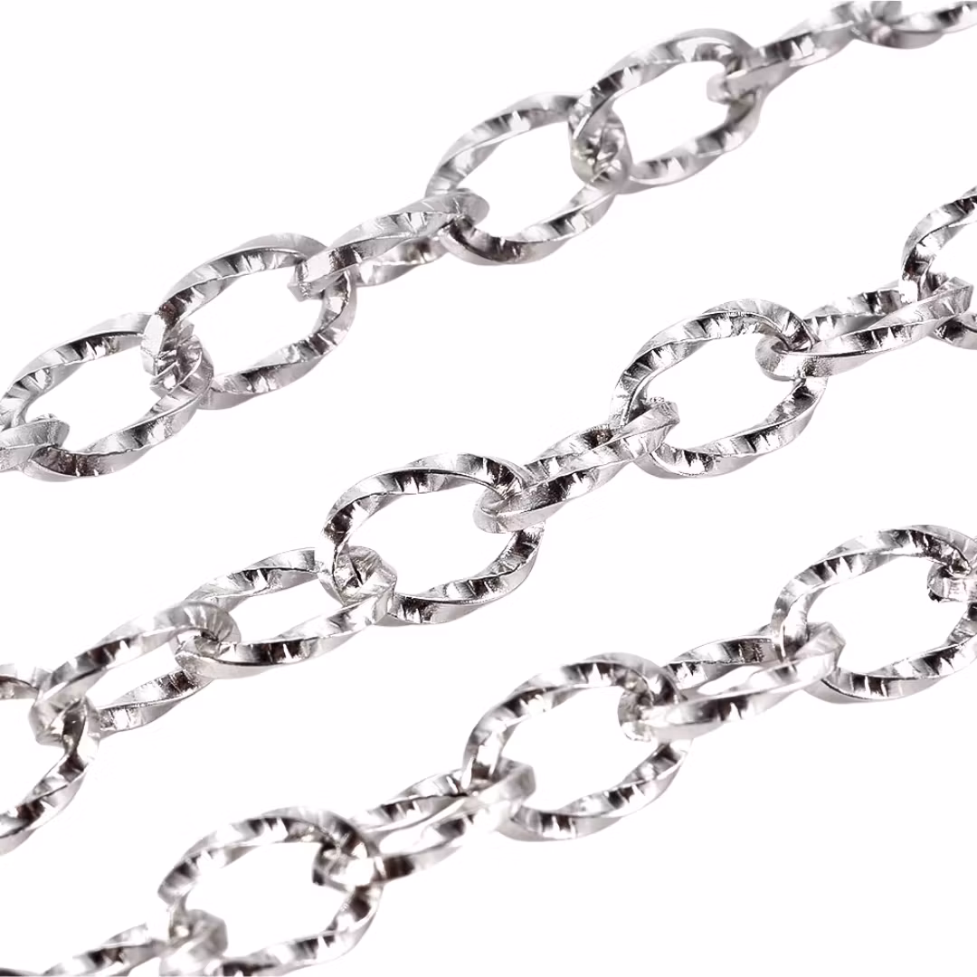 Kedja av rostfritt stål 304 med PVD plätering. Mått: ca 5.5 mm. Kedjan är kapad i 1-meters bitar. Använd plattänger för att öppna öglorna.