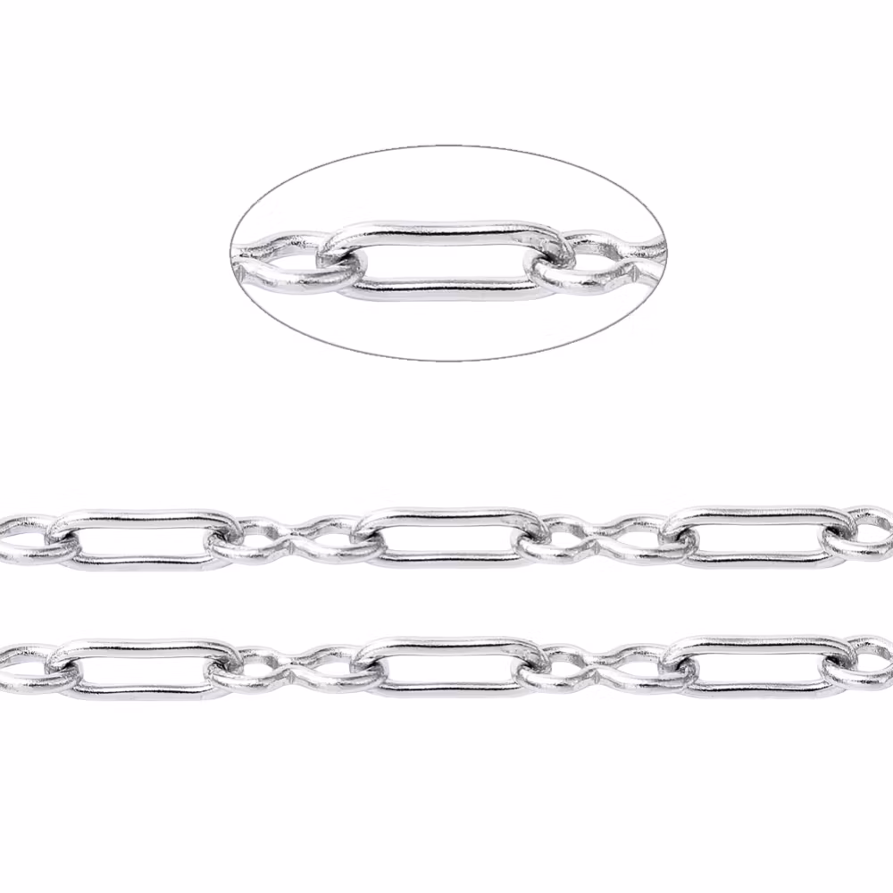 Kedja av rostfritt stål 304, ej öppningsbara öglor. Mått: ca 1.8x5x0.5mm. Använd en avbitare för att kapa kedjan.