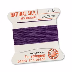 Pärlsilke nr 5, motsvarar 0.65 mm. Tråden levereras med en metallnål och passar de flesta 4 mm halvädelstenar.