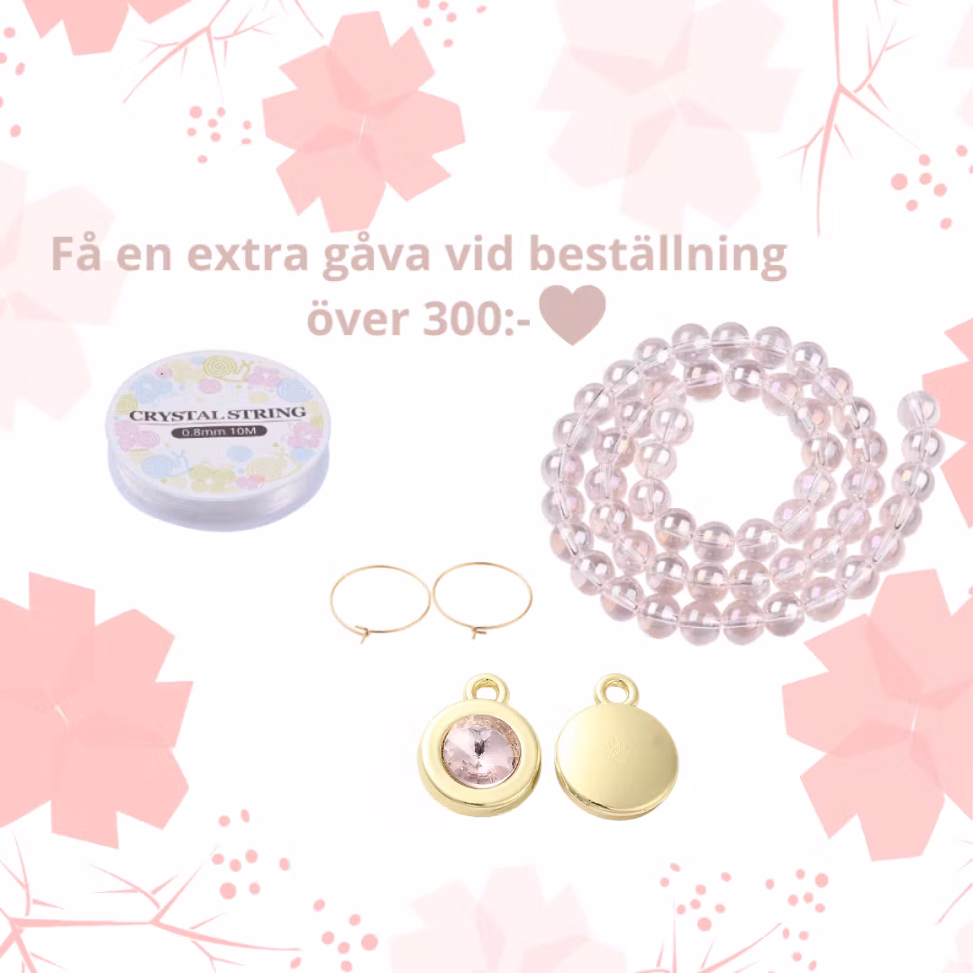 Gåvan innehåller 1 sträng ljusrosa glaspärlor, 1 rulle elastisk tråd, 1 par creoler i guldfärgat rostfritt stål och 1 par nickelfria berlocker.