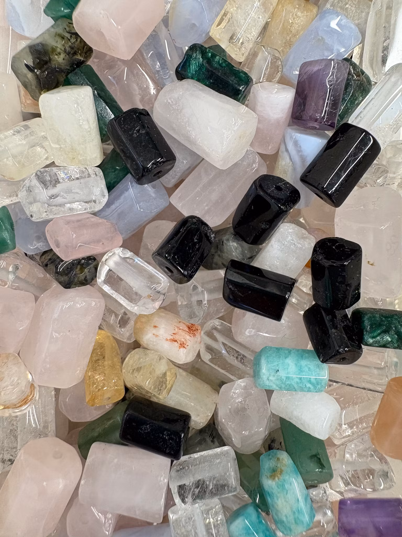 En påse med 10 st mixade små och något större cylindrar av halvädelsten, 2:a sortering. Alla påsar är packade slumpmässigt med olika stenar. Alla cylindrarna  är mycket ojämna med sprickor och färgskiftningar.
