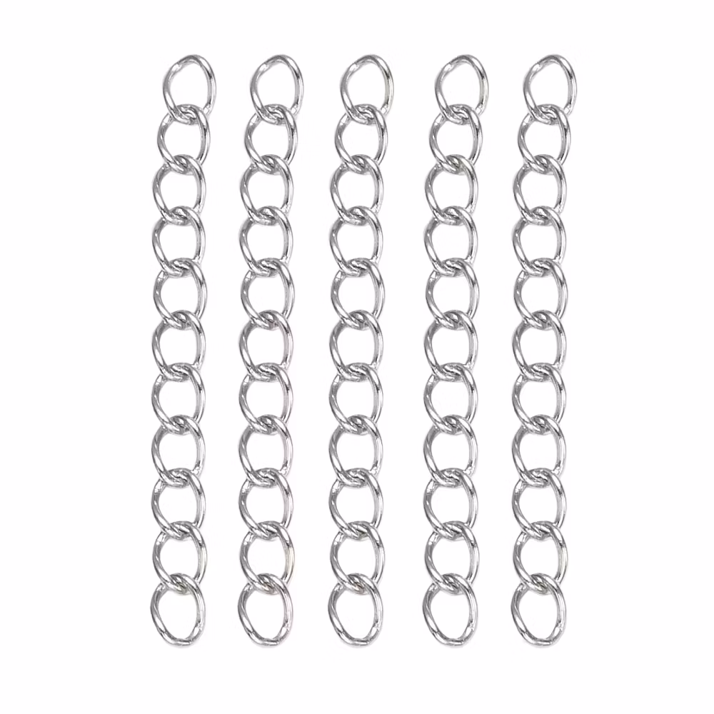 Förlängningskedjor i rostfritt stål 304 med PVD plätering. Längd ca 5 cm, bredd ca 3 mm.
