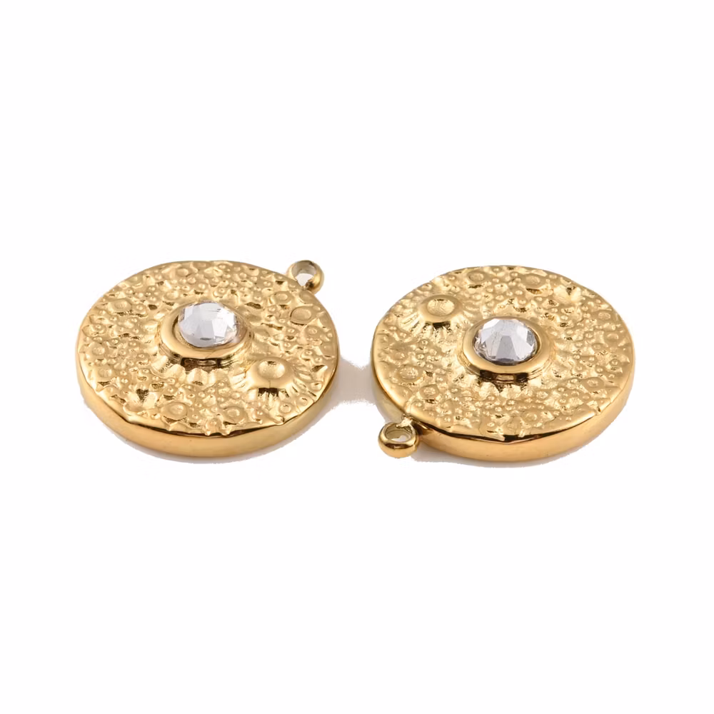 Guldfärgat rostfritt stål runt hänge med strass och sol, PVD plätering, 1 st