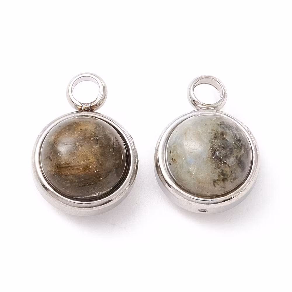 Berlock av rostfritt stål 304 och halvädelsten. Mått: 13.5x10x7.5mm, hål: 2.5 mm. Ojämnheter och färgskiftningar förekommer.