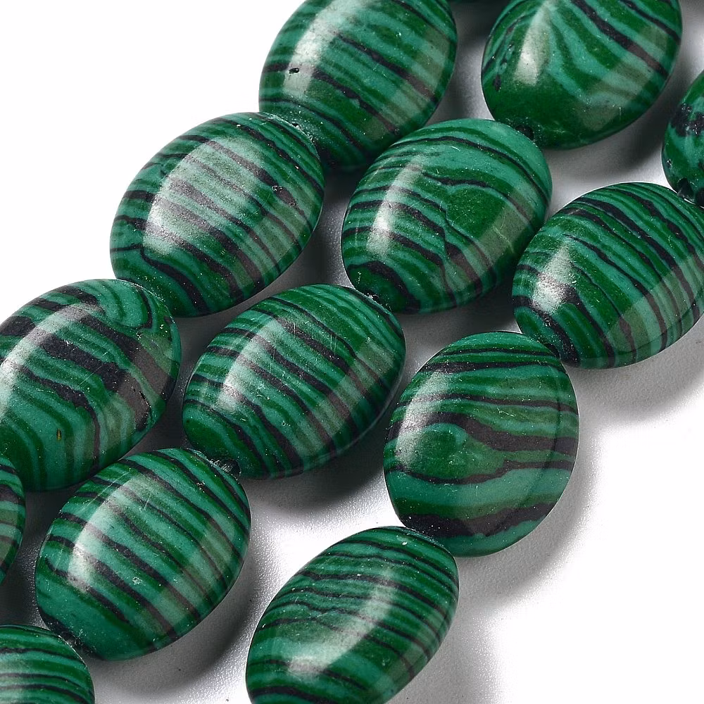 1 slät sten med genomgående hål av syntetisk malakit. Alla stenar är olika och färgskiftningar förekommer. Mått 18~18.5x13~13.5x6~6.5mm, hål ca 1 mm.
