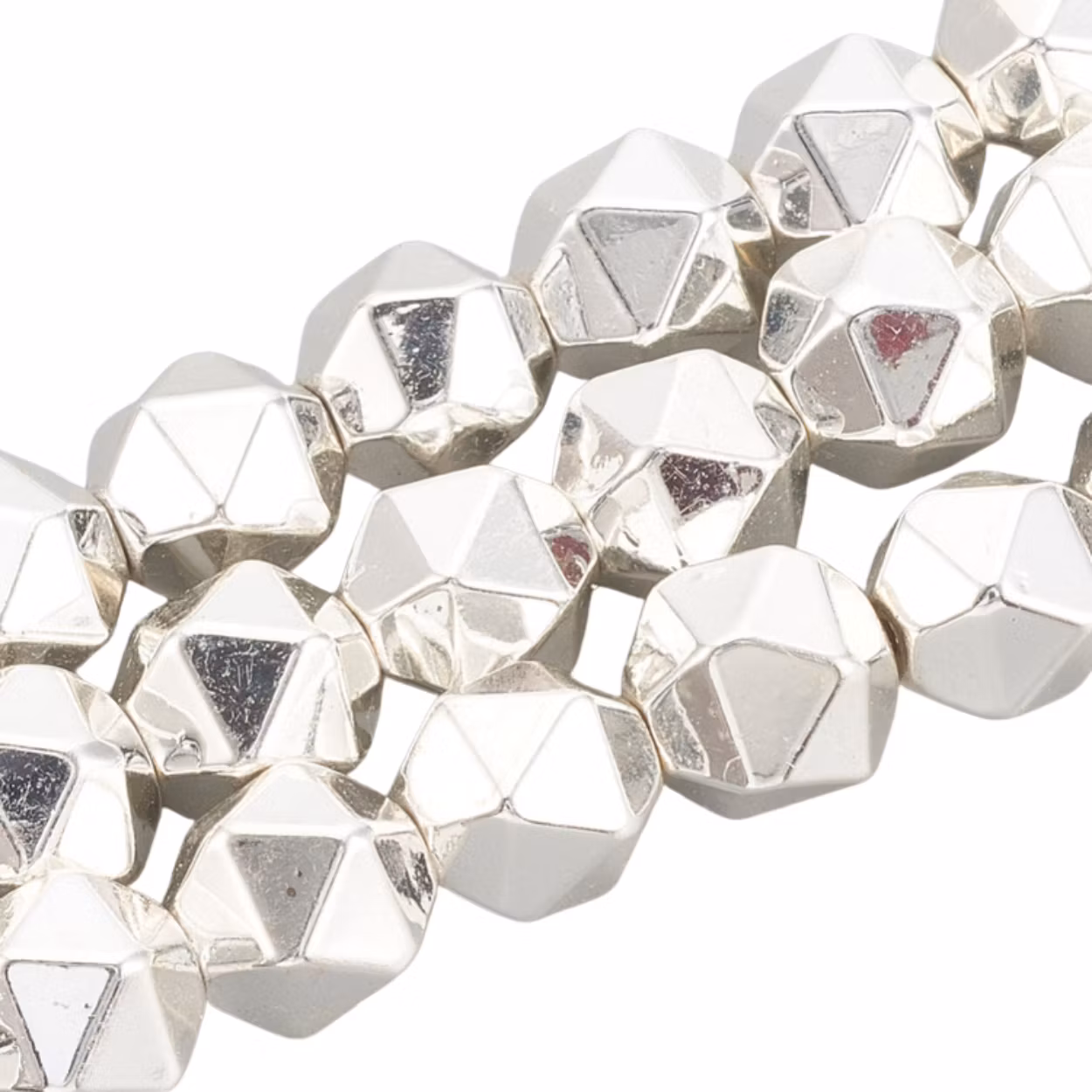 10 st stenar av omagnetisk hematit. Stenarna är något ojämna och färgskiftningar kan förekomma. Pärlans hål är ca 1 mm.