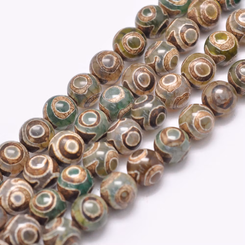 Tibetansk halvädelsten Dzi grön & brun 8 mm, 1 sträng