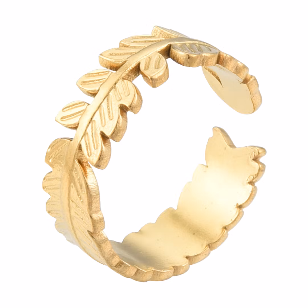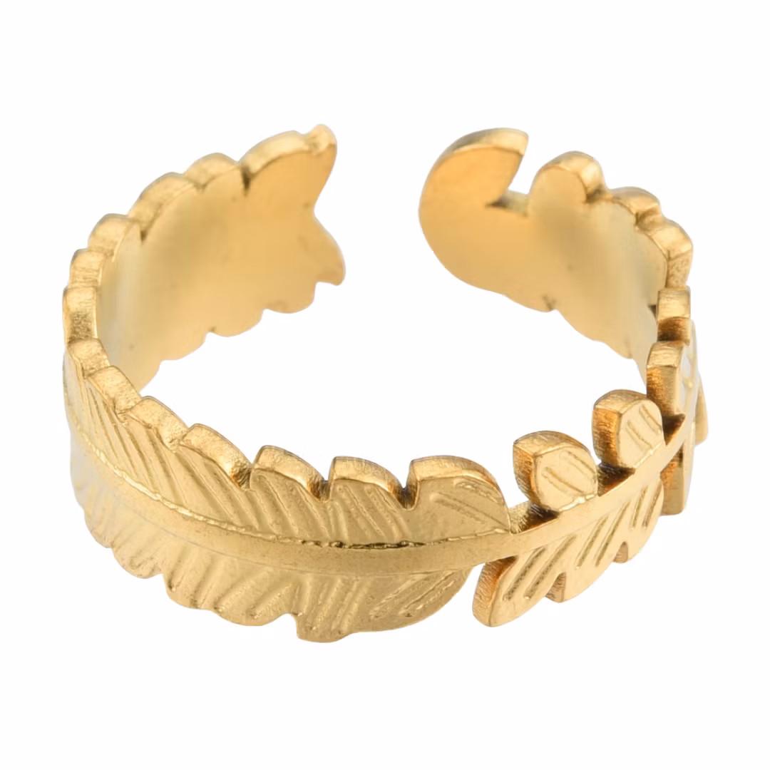 Guldfärgat rostfritt stål ring löv med PVD plätering