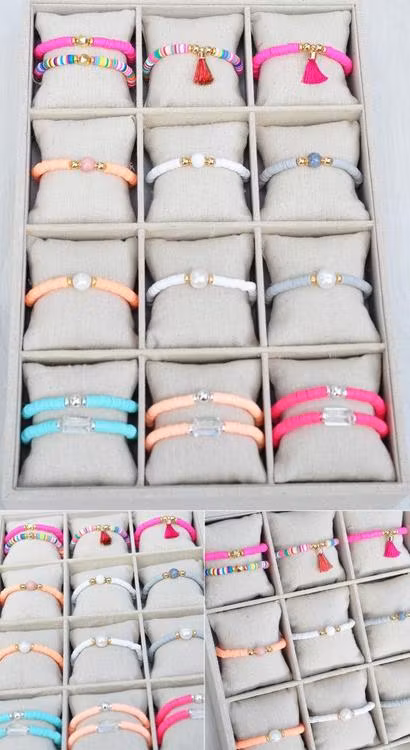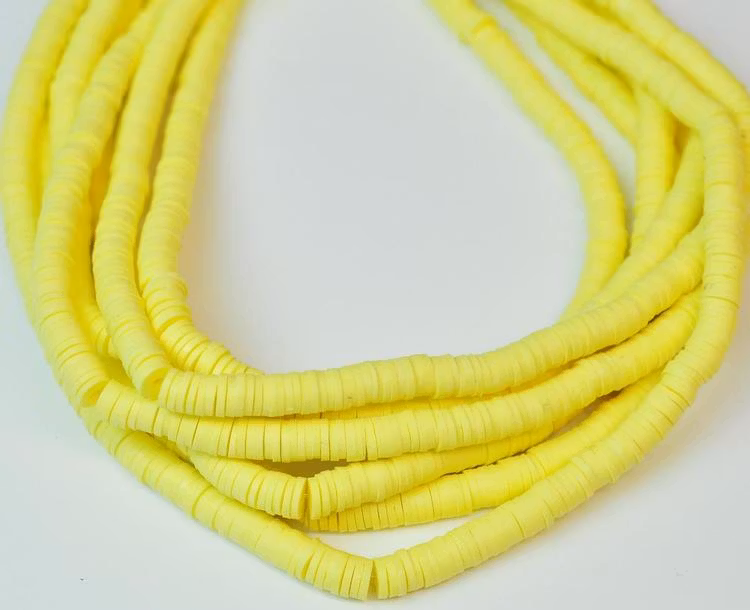Heishi pärlor, rondeller av polymerlera. Mått: ca 6x0.5-1mm. Hål: ca 2 mm.