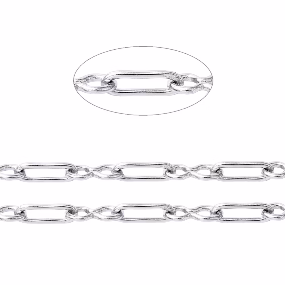 Kedja av rostfritt stål 304. Mått 1.8x5x0.5mm. Kedjan är inte öppningsbar och är kapad i 1-meters bitar. Använd en avbitare för att kapa kedjan.