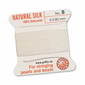 Pärlsilke nr 8, motsvarar 0.8 mm. Tråden levereras med en metallnål och passar de flesta 6 mm och 8 mm halvädelstenar.