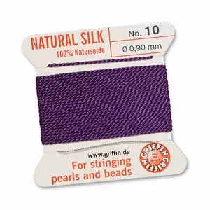 Pärlsilke nr 10, motsvarar 0.9 mm. Tråden levereras med en metallnål och passar de flesta 8 mm halvädelstenar.