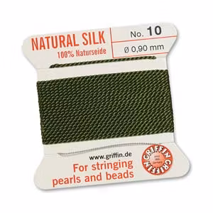 Pärlsilke nr 10, motsvarar 0.9 mm. Tråden levereras med en metallnål och passar de flesta 8 mm halvädelstenar.