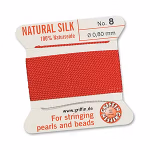 Pärlsilke nr 5, motsvarar 0.65 mm. Tråden levereras med en metallnål och passar de flesta 4 mm halvädelstenar.